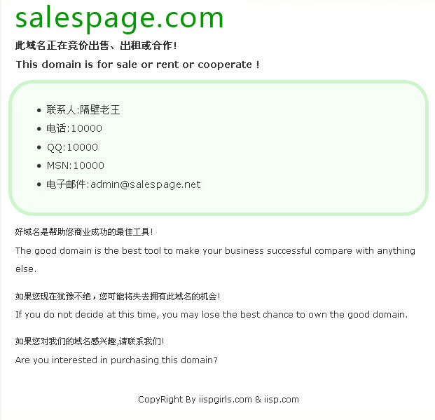 在域名注册成功后,您不需要购买空间即可免费拥有一个域名展示页面,您可以设置您的联系人姓名、电话、QQ、邮件等信息,当用户或者搜索引擎直接访问您的域名时,即可查看到该展示页面。